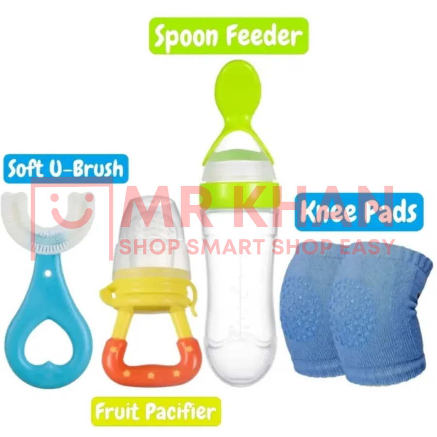 Includes pacifier fruit feeder, crawling knee pads, U-style toothbrush, and silicone spoon feeding bottle. Safe, durable, and perfect for infant care and feeding.