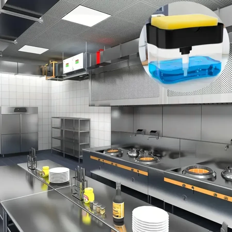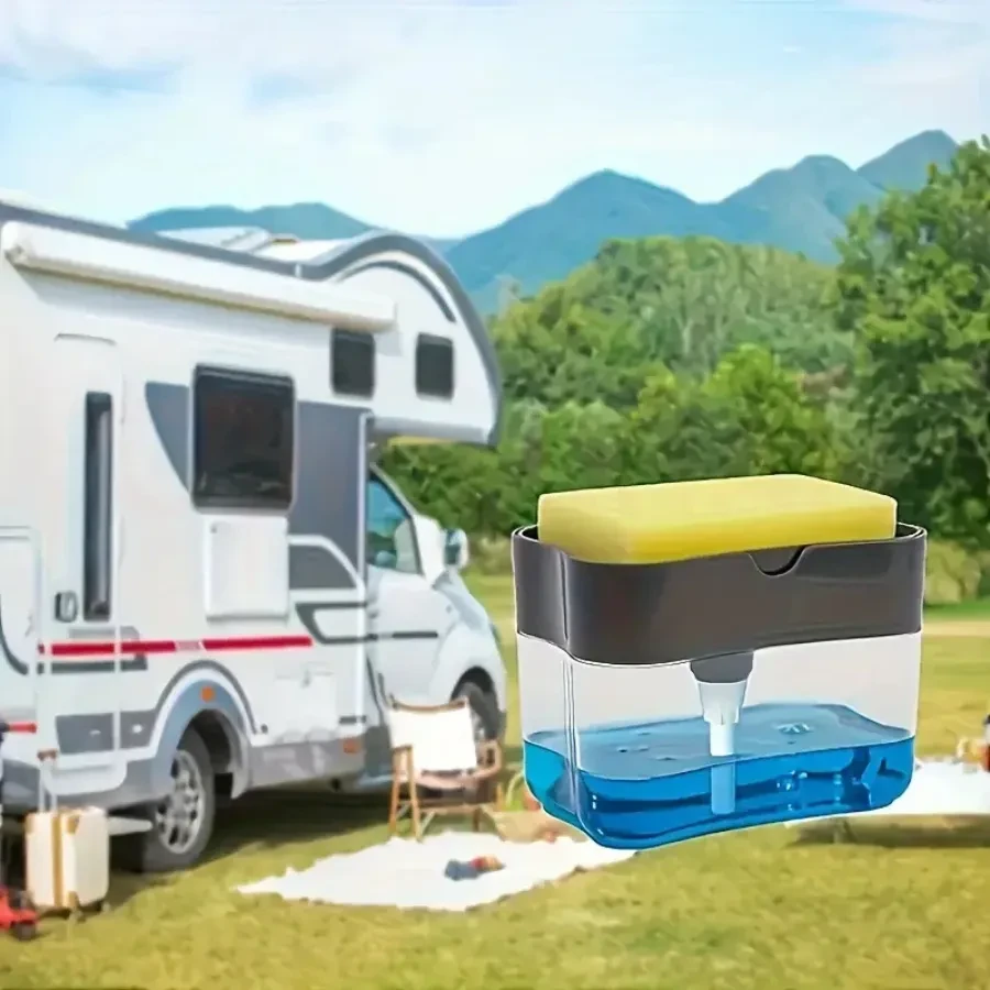 A manual pump dispenser with a built-in sponge holder, designed for commercial kitchens and dishwashing stations. Durable, efficient, and perfect for industrial food service use.