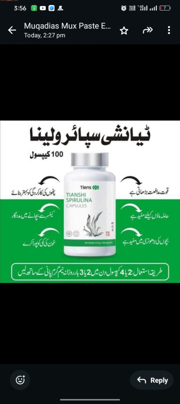 Food supplement containing dried algae powder Spirulina. A rich source of protein, vitamin B, copper and Iron.